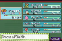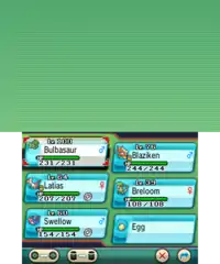 Viewing the party in the menu will display their name, icon, current HP, status condition, and level in all games. From the party, it's possible to visit the Pokémon's summary. When not in battle, it's also possible to give or take a held item (from Generation II onwards), and also change the order of the Pokémon in the party.