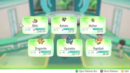 In Let's Go, Pikachu! and Let's Go, Eevee!, the party screen is displayed in a more horizontal manner, with Pokémon organized in two rows of three, instead of two columns. From these games onwards, Pokémon icons are no longer restricted to the same size, and some of the icons (mostly those of fully evolved or Legendary Pokémon) were replaced with larger ones.