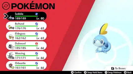 In Sword and Shield, the party screen reverted to its original form, with the entire party presented as a single column. The rest of the screen displays the Pokémon's moves if shown in battle, otherwise its model is shown. If a Pokémon is holding an item, the item's specific icon is shown instead of a generic box.