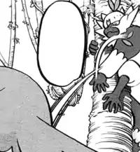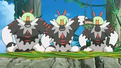 The Melemele Greens are a group of Passimian who live in a forested area close to Iki Town. The members of that group have green markings and are from a forest behind Iki Town on Melemele Island. As such, they are referred to as (Japanese: メレメレグリーンズ Melemele Greens), with their leader being nicknamed (Japanese: タイニー Tiny). As the episode only aired in Asia, they don't have English names.