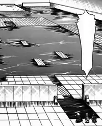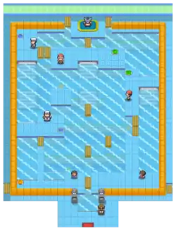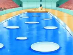 Like most Water-type Gyms in the anime, the Gym's battlefield is featured as a pool with several floating platforms on it for non-swimming Pokémon.