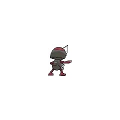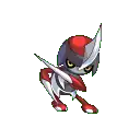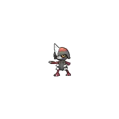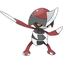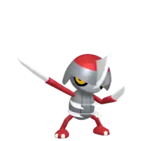 Pawniard is a small, bipedal Pokémon with a vaguely beetle-like appearance. It has a rounded red and black head with a silvery blade extending from the front. Its face is gray with yellow eyes. Four steel spikes protrude from its black torso, two on each side connected by steel ribs. It has red arms that end with knife-like blades instead of hands, which it regularly sharpens with its favorite sharping stones found by rivers. When hunting, Pawniard immobilizes prey by repeated stabbing with these blades after clipping on to them. It then clangs the two blades together afterwards. Its legs are red with two-toed feet.