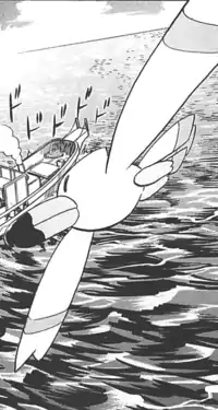 However, Mr. Briney had a Wingull-shaped boat ready which was modeled after his Peeko. He took Ash and the others, and they chased down the Team Aqua Grunt. The two boats raced around until Mr. Briney had his boat jump up to block the boat the Grunt was riding on. With the Grunt stopped, Peeko ended up being returned to Mr. Briney. This did not stop the Grunt as he ended up escaping on Team Aqua's submarine. With the Grunt gone, Peeko and Mr. Briney were reunited.