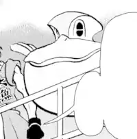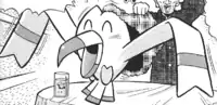 In the next chapter, after a Crawdaunt attacked their ship, Peeko distracted the Crawdaunt by attacking it when Ruby was trying to save Mr. Briney. However, Peeko ended up getting a broken beak as she charged straight into Crawdaunt's armored exoskeleton. This was when Crawdaunt's Shell Armor Ability activated, which prevented it from getting hurt by Peeko's attacks. Ruby ended up nursing her beak and healed her wound (he also adorned her with his "brand" of fashionable make-up). When Mr. Briney dropped off Ruby at his destination and met up with Sapphire, Peeko sailed away along with Mr. Briney.