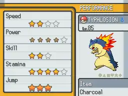 A Pokémon's performance (Japanese: パフォーマンス performance) is made up of stats that exist for use in the Pokéathlon. There are five different performance stats; Speed, Power, Skill, Stamina, and Jump.