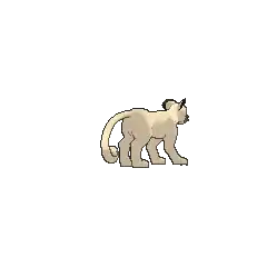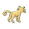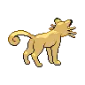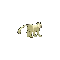 Persian is a large, quadrupedal, feline Pokémon. Its fur is pale tan with the exception of its black-rimmed ears. It has a short muzzle with a small, black nose, red eyes with slit pupils, rounded ears, a pair of pointed teeth in its upper jaw, and three whiskers on either side of its face. Its thick whiskers are very sensitive to changes in air movements, enabling it to detect its prey by movement alone. In the center of its forehead is a red jewel. Its long tail has a distinctive curl at the end. Persian communicates with body language and holds its tail upright to signal its intention to pounce. It has long legs and three-toed paws with retractable claws. Persian's lithe muscles also enable it to walk without making a sound.