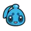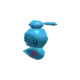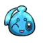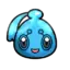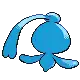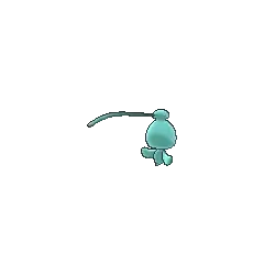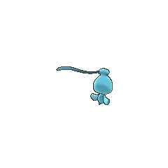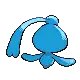 Phione is a blue Pokémon with a round head and a tiny body. Phione's head is crowned by a flotation sac with a long, ribbon-like antenna. Its mouth is small, and its eyes are large with blue sclerae and gray irises. Above its eyes are two blue, circular markings connected to the eyes by a thin black line. Its long, flipper-like arms have rounded tips. Phione has a red, oval gem on its chest and a single rudimentary foot spike.
