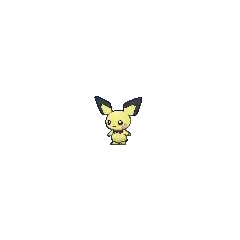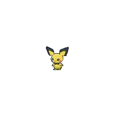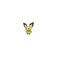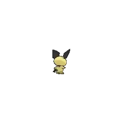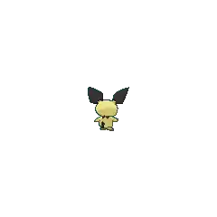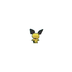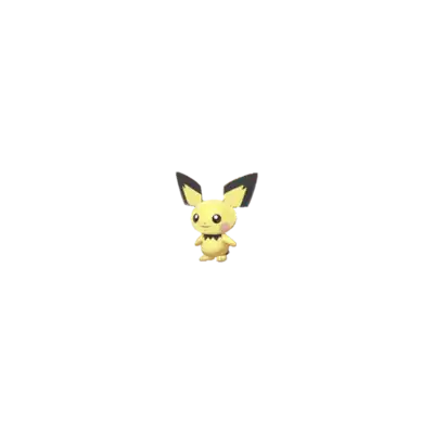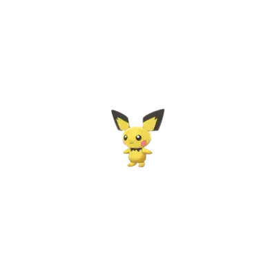 Pichu is a small, ground-dwelling rodent Pokémon with pale yellow fur. Its ear-tips, collar, and tail are black and angular. Pichu's pink cheek pouches can store small amounts of electricity, and its tiny nose looks like a dot. Pichu is classified as a quadruped, but it can walk easily on its hind legs.
