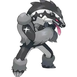 | Obstagoon is Piers's first known Pokémon. It was first seen guiding Raihan to the secret entrance to Spikemuth. It later defeated Sordward's Doublade in Spikemuth, but was stopped from finishing the brothers off by Marnie.
