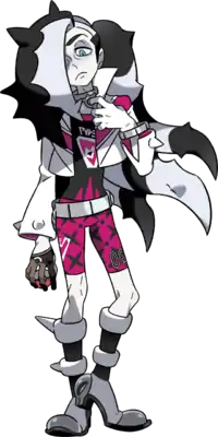 Piers (Japanese: ネズ Nezu) is the Gym Leader of Spikemuth and the boss of Team Yell. He specializes in Dark-type Pokémon. He gives the Dark Badge to Trainers who defeat him. During the events of Pokémon Sword and Shield, he retires from his position as a Gym Leader and passes the title on to his little sister, Marnie.