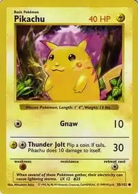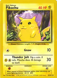 Pikachu (Japanese: ピカチュウ Pikachu) is a Lightning-type Basic Pokémon card. It was first released as part of the Base Set.
