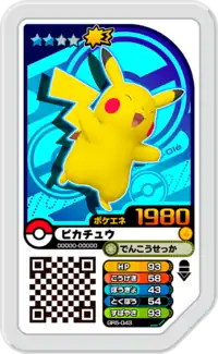 Pikachu (Japanese: ピカチュウ Pikachu) is a Grade 2 Pokémon Ga-Olé disk. It is part of the fifth Grand Rush set.