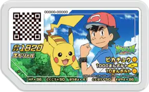 This disk could be obtained by successfully capturing Pikachu while playing either the Let's Begin Ga-Olé! Course or the Zeraora Course, which were updated on consoles starting December 13, 2018. The courses became unavailable to play after February 13, 2019. As a tie in with the Pokémon anime, the illustration features Ash and his Pikachu as well as the Japanese Pokémon the Series: Sun & Moon logo. A promotional transparent purple lamé version of this disk was 1 in a set of 3 disks available as part of a lottery announced following the Japanese broadcast of We Know Where You're Going, Eevee! on December 2, 2018. The application period was open until December 9, 2018. This promotion was tied to the celebration of the anime TV debut of Zeraora in Battling the Beast Within!. Other disks in the set comprised transparent purple lamé versions of Zeraora and Mimikyu. Only 20 sets were distributed as part of the lottery, which winners received in late February 2019.