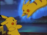 When he encountered Ash's Pikachu again he initially reacted violently, blaming him for leading humans to Mount Quena and telling him to "Get out, or [he'll] regret it". Despite Mewtwo's orders to cease, Pikachutwo still launched himself at Ash's Pikachu only to be stopped by Mewtwo just before his attack hit. It was then revealed that Pikachutwo held a lot of resentment towards Ash's Pikachu because he is free to go and do whatever he wants, whereas Pikachutwo and the other clone Pokémon are always forced to hide. He vehemently argued against Mewtwo's proposal of leaving their home and finding somewhere else to hide, and insisted that they must fight for their freedom. The next morning, he lead a breakaway group of clone Pokémon as well as Ash's Pikachu and Meowth to battle the incoming Team Rocket Combat Unit, but all were defeated by a combination of a paralyzing gun from the leader Giovanni's helicopter and Poké Balls dropped from blimps from the sky. This was in spite of Ash's Pikachu attempts to save him, blasting away the Poké Ball that was falling towards his clone with his Thunderbolt. This action seemed to soften Pikachutwo's feelings towards Ash's Pikachu, and the two were then seen side by side from that point onward. The encounter forced Mewtwo to act and save the clone Pokémon, leaving their island home and others living there exposed to the cruelties of the Grunts who flew there.