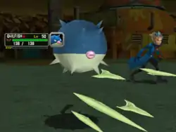 Qwilfish sucks up water to expand its body. Then, it glows white and shoots white needles at the opponent, its body gradually shrinking to regular size. | ||