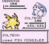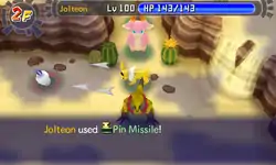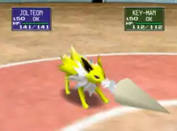 Jolteon's fur becomes spiky and fires multiple yellow needles from it at the opponent. | ||