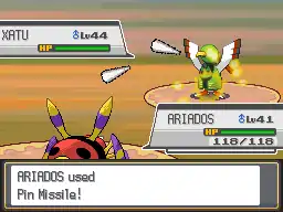 | Ariados fires white orbs trailing green streams of light from its back at the opponent, or the appendages of Ariados's back glow light green, and it fires light green spikes from them at the opponent. | |||