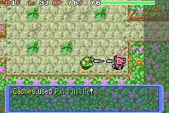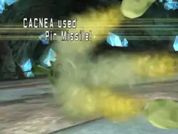 | The spikes on Cacnea's arms glow white and shoot either a barrage of white needles or white, arrow-shaped streams of pins at the opponent. Sometimes the pins are fired from the spikes on its head. | |||