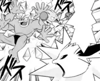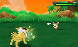 The fur on Jolteon's backside grows longer and sharper and points forward, then fires spear-like pins at the opponent. | ||