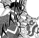 Drapion's claws glow white and are raised above its head, where a thin, white line forms and connects them. Drapion thrusts its claws forward and shoots white streams of pins at the opponent. It can also fire pins from its tail claw. Or Drapion fires white orbs trailing green streams of light at the opponent from its claws at the opponent. | ||