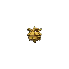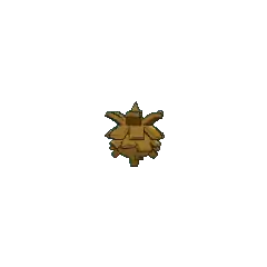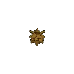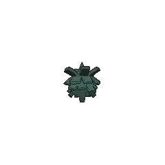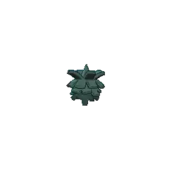Pineco is a blue-green, pine cone-like Pokémon with red eyes and no visible limbs. It has a single spike on top of its head, which is supposedly its stem. It makes its shell thicker by gluing tree bark to its body. The glue is made of fluid that Pineco spits out, which hardens when it is exposed to air. Unbothered by the added weight of its shell, it patiently hangs from a tree branch in tropical and temperate forests, waiting to prey on flying insects. In Alola, its favorite prey is Cutiefly. Typically immobile, it will drop to the ground and explode if someone shakes its tree while it is eating.