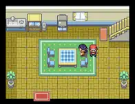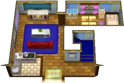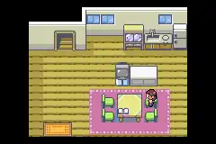 The first floor features a dining area, a television, and a kitchen. Both bedrooms feature a TV, a Nintendo GameCube (the in-game text says that a GBA is connected to the GameCube, but the sprite shows a regular GameCube controller)RSE/a Wii U with a GamePadORAS, a town map, a notebook with basic control instructions and a clock on the wall, which serves as the only indicator of time in the game.