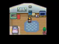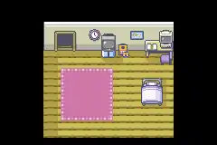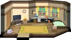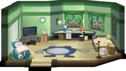 The player's room has a PC, a bed, and a TV with a video game console hooked up to it. In the Generation III games, a sign can also be found on the wall by the stairs to the living room, informing the player that pressing the L or R button will bring up the Help feature. In the Generation VII games, there is a Pikachu or Eevee plush depending on the version being played (Let's Go, Pikachu!, or Let's Go, Eevee!), and the player can also interact with a globe located at the southeast corner of the room.