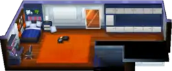 In Pokémon XD, the player, Michael, has his bedroom located in the western part of Pokémon HQ Lab. The bed can be used to heal the player's Pokémon, and the player will appear in the room upon completion of the main storyline.