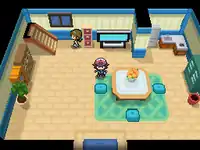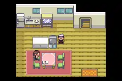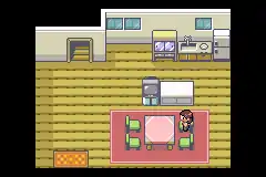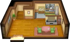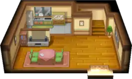 The living room downstairs has a TV and a dining table, where the player's mother can be found. After the player receives their starter Pokémon, their mother can fully restore the player's Pokémon, just like at a Pokémon Center. The Generation III and Generation VII remakes include a small kitchen-like area at the northeast corner of the living room.