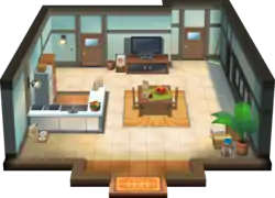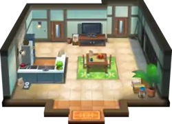 The house consists of four rooms, all arranged horizontally on a single floor. To the far left is a family room with a TV for Mum's comedy-dramas, a fireplace, and some bookshelves. The family's Munchlax can be found in this room, along with its bed. To the right of that is an entryway room with some umbrellas and jackets, as well as a mirror. To the right of the entryway is the kitchen, where Mum can be found, and the kitchen then leads into the player's room.