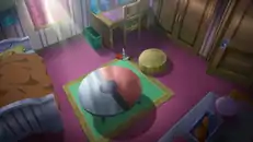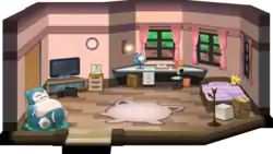 The player's room has a similar layout regardless of the character's gender, although the color schemes are different. On the bottom left, there is a Ditto pillow and a Poké Toy, which are "covered in Meowth's claw marks". Like X and Y, there's a TV with a Wii U in the top left corner. On the nightstand is a Pikachu doll. Looking at the globe on the player's table makes the player think "Kanto and Alola seem awfully far apart" and the opened book lists adventure rules. On the right side of the room is a bed and some moving boxes. After the player obtains the Zygarde Cube, a cell can be found in the player's room. In Ultra Sun and Ultra Moon, a few things are replaced. The Ditto doll is replaced by a Snorlax cushion, the Wii U is replaced by a Nintendo Switch, and the Pikachu doll is replaced with an autograph of a Kanto Gym Leader. The Pikachu doll is now located on the bed.