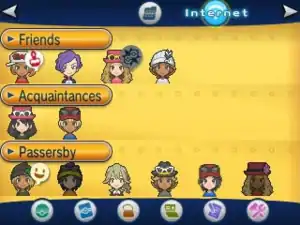 The main window of the PSS divides other players into three categories: Friends, Acquaintances, and Passersby, each of which can have a maximum of 100 players. A Passerby will automatically become an Acquaintance if a Battle or Trade (including Wonder Trades) is made with them. After trading or battling with an Acquaintance, a prompt to add them to the Friends group will appear.