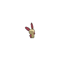Plusle is a cream-colored bipedal Pokémon with red markings. It has a dot-like nose, and a cream-colored plus sign in the middle of its circular red cheeks. It has long, flat ears that are mostly red. Its limbs are stubby and digitless, and it has red front paws. Its short tail is tipped with a red plus sign.