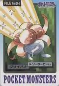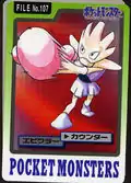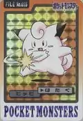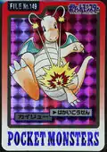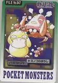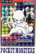 The front of the standard cards of Part 1 & Part 2 were primitive in their appearance, as the artwork was early in its creation, and feature the words "Monsters Collection" emblazoned along the base of the card and "Pocket Monster" and card number at the top front of the card. The back of the cards provide information about the Pokemon Statistics, and also details the 1995 copyright, along with 1996 Made in Japan, Bandai. 12 Prism (Holo) cards were available in this set, including Mew & Mewtwo.