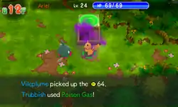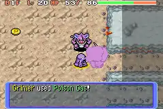 In Red Rescue Team and Blue Rescue Team, Poison Gas is a move with 27 PP and 100% accuracy. The user targets enemy in the front, inflicting poison if possible. This move is affected by Magic Coat and Taunt.