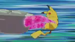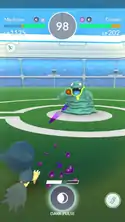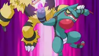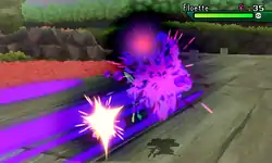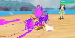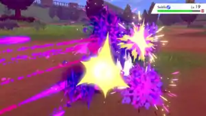 Poliwrath Poliwrath punches the opponent, with a purple flash of light appearing as the move makes contact.