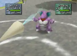 Nidoking releases a spray of multiple purple darts from its mouth at the opponent. | ||