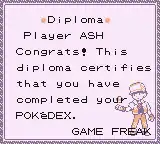 The in-game rewards are usually a congratulations from the director's avatar and a diploma, usually one for completing the regional Pokédex and one for the National Pokédex. In Emerald, the player could choose from one of the Johto starter Pokémon for completing the Hoenn Dex. The completion of the Pokédex also usually allows the player to upgrade their Trainer Card. Also, in Pokémon Black and White, the diploma will appear on the shelf in the player's bedroom.