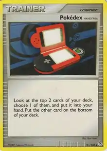 This listing is of cards mentioning or featuring the Pokédex in the Pokémon Trading Card Game. The Hoenn region's model did not receive a TCG card, and the Generation I and Generation II Pokédexes, which featured model numbers on the Japanese cards (HANDY505 and HANDY808 respectively), did not show these model numbers on the English card. The Generation V Pokédex has no model number even in the Japanese card; it also has the same effect and English name as the Generation I Pokédex. Every card has allowed the player to look at a certain number of cards from the top of their deck and then either arrange them as they like, or in the case of Pokédex HANDY910is, choose one to put in their hand.