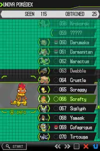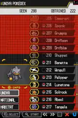 The Generation V Pokédex is similar to the Pokédex from Pokémon Diamond, Pearl, and Platinum. It is displayed as a list on the right side of the lower screen with the selected Pokémon's sprite occupying the left side. Most of its functions are also similar to Generation IV's. Instead of showing the time of day that a Pokémon can be caught, as in Generation IV, the Pokédex shows the seasons in which it can be found. Areas in which the Pokémon can be found flash red, and touching an area will show the methods by which it can be caught (walking in tall grass, surfing, or fishing). The height and weight comparison feature has been removed, but a section showing form differences and a search feature are added by Cedric Juniper when the player visits Mistralton City. The form difference section will now show Shiny Pokémon as well as form differences. The last sprite selected will become the one displayed in the main entry. The ability to collect foreign Pokédex entries now only applies to the first 493 Pokémon, but the player can now also collect Korean Pokédex entries. The cry page has been added again as well.