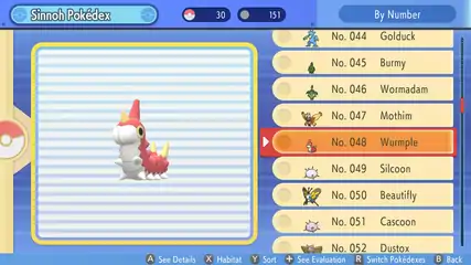 Generation IV brought the Search function back, as well as Heaviest and Tallest orders. Habitat was dropped. Searches could now be conducted by Form, but not by Color. The two Pokédex modes were Sinnoh and National. National mode was unlocked by seeing every Pokémon in the Sinnoh Dex.