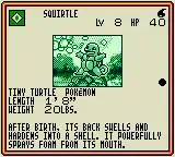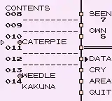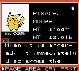 In Generation I's Pokédex (model HANDY505), the entries are simple and each individual section can be accessed directly from the listing. The first, and main option—"Data"—includes an image of the Pokémon, its number, name, category, height, weight, and a short blurb. The second option—"Cry"—does not open a new screen; selecting it simply plays the Pokémon's cry. The last option—"Area"—displays the map, along with flashing indicators at each location where the selected Pokémon can be found; in cases where the Pokémon is not available in the wild, is only available once, or can only be found by fishing or in the Unknown Dungeon, the message "Area Unknown" will be displayed over the center of the map instead. Pokémon Yellow allows players to print entries using the Game Boy Printer.