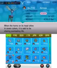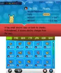 In the National Pokédex, there are color codes used to represent Pokémon introduced in each generation: red for Generation I, yellow for II, green for III, blue for IV, pink for V, and silver for VI. Like in Generation V, players may choose the default entry image for each Pokémon species, as long as they have seen that gender, coloration, or form of that species before. Like in previous games, acquiring Pokémon from foreign-language games will unlock the ability to view entries in those languages, so long as the player owns or has owned a Pokémon from that language. This time, all Pokémon entries can be obtained, allowing for both Generation V and VI entries for the first time.