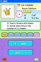 HeartGold and SoulSilver changed the formatting again, now displaying the list on the lower screen and the actual entry on the top screen. Cry's page was again removed. By selecting "view details", players can view Area, Size and Forms. Area no longer defaults to the current time or differentiated for Honey due to it no longer being a mechanic, Size now utilized both screens to display both Height and Weight at the same time, and Forms added a Compare option to see different forms side by side instead of having to scroll between them. Entries for Johto and Kanto Pokémon were taken from Gold for HeartGold and Silver for SoulSilver. Players can collect foreign Pokédex entries without the need to update their Pokédex. Also, while artwork shows a pink Pokédex for females, the in-game interface does not reflect this.