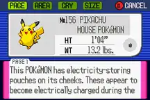 Generation III's Pokédex did not add anything to the main entry; however, Cry was given its own page, which displays the sound wave as it played. In addition, the Area section was changed to highlight locations instead of just marking them and can now display the locations of Pokémon obtainable by fishing. A Size section was added, which displays silhouettes of the Pokémon and the player character side by side. In Pokémon Ruby and Sapphire only, there is a Page button to switch between pages of multi-page Pokédex entries.