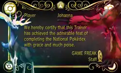 In Pokémon X and Y, Professor Sycamore will reward the player with an Oval Charm upon seeing all Pokémon in the Kalos Pokédex, except for Articuno, Zapdos, Moltres, and Mewtwo. Upon completing the National Pokédex, the player will receive a Shiny Charm from Sycamore.