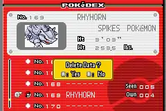In Pokémon Pinball: Ruby & Sapphire, it is possible to delete the Pokédex data by pressing left while simultaneously pressing L + R three times. This brings up a prompt asking confirmation to delete the data.