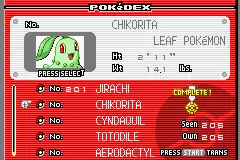 In Pokémon Pinball: Ruby & Sapphire, a medal with the word "complete" appears if the first 201 Pokémon from the Hoenn Pokédex are caught (that is, all available Pokémon are required, except for Chikorita, Cyndaquil, Totodile, and Aerodactyl).