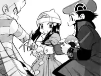 Diamond and Pearl are childhood friends from Twinleaf Town that aim to become masters of comedy. They took part in a contest held by Jubilife TV that would reward the best stand-up comedians, but failed in their performance. However, they received a special prize for their peculiar humor, tickets for a travel. Before opening the envelope with the tickets, they bumped against Professor Rowan and his assistant (Lady Berlitz's father) in the middle of a crowd and ended up having their envelope exchanged with the one containing instructions for the Lady's bodyguards on their travel to Mt. Coronet. Arriving at the meeting point, they assumed she was a tour guide for their trip, while she thought they were her bodyguards, giving each a Pokémon, a Pokétch and a Pokédex. The trio traveled around Sinnoh until the misunderstanding was clarified, when she decided to reveal her first name, Platinum.