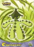 Cacturne | Found in deserts and dry areas, these evolved Cacnea look almost like people with two arms, two legs, and a goofy hat. Unlike people, these powerful Grass type Pokémon are covered with needles. |